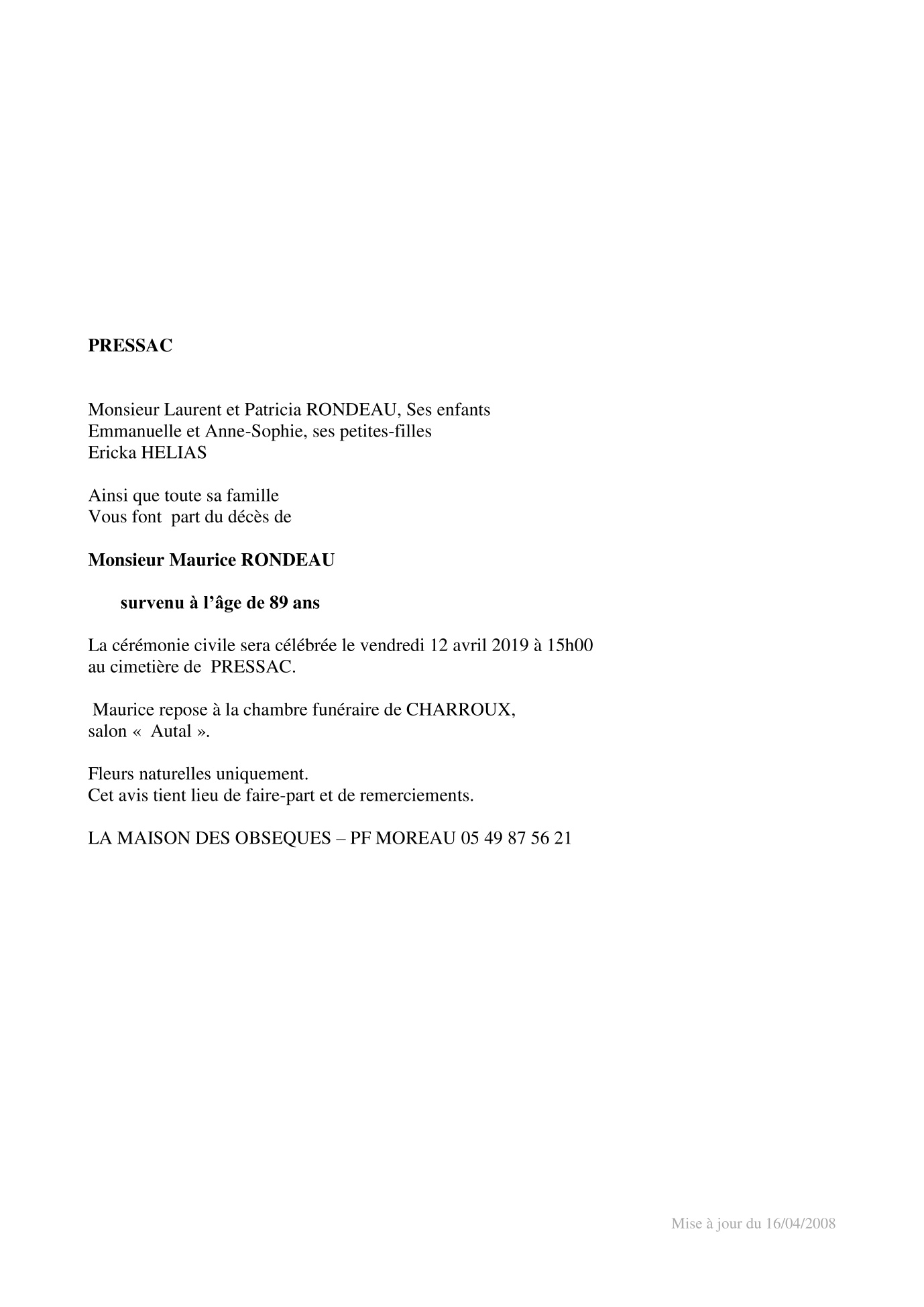 La source : hommages.ch Décès De Monsieur Maurice Rondeau 06042019 Fr Fr